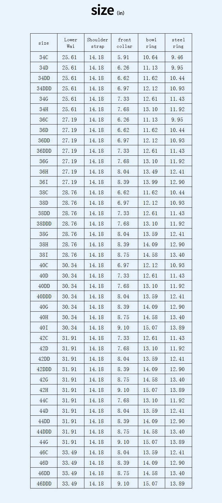 - Cup Size: If you are unsure about your cup size, the difference between your bust and band measurement will help determine it (refer to the size chart for guidance).